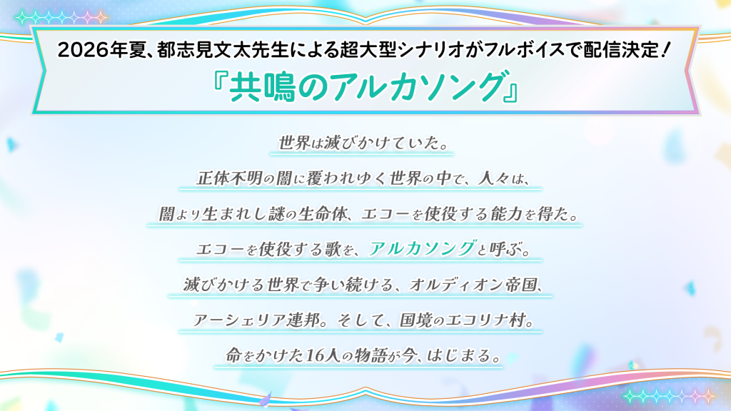 2026年夏、都志見文太先生による超大型シナリオ『共鳴のアルカソング』がフルボイスで配信決定!