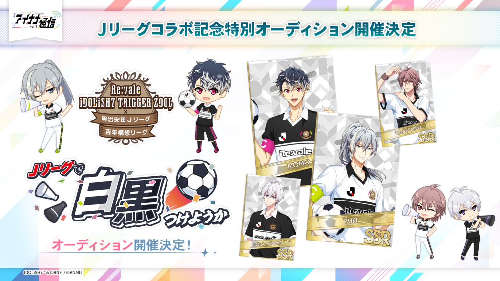 『Re:vale ・IDOLiSH7・TRIGGER・ZOOL × 明治安田Jリーグ百年構想リーグコラボレーションにて公開された、白と黒のユニフォームを身にまとったアイドル16人が登場するオーディションが開催決定!