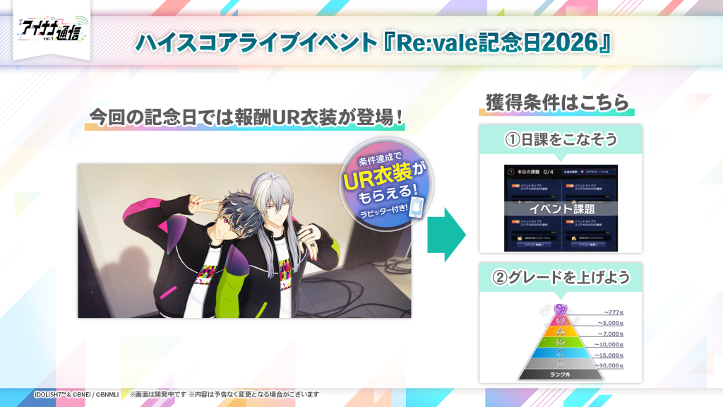 本イベントでは、イベント楽曲7曲の合計ハイスコアによって順位が決定します。