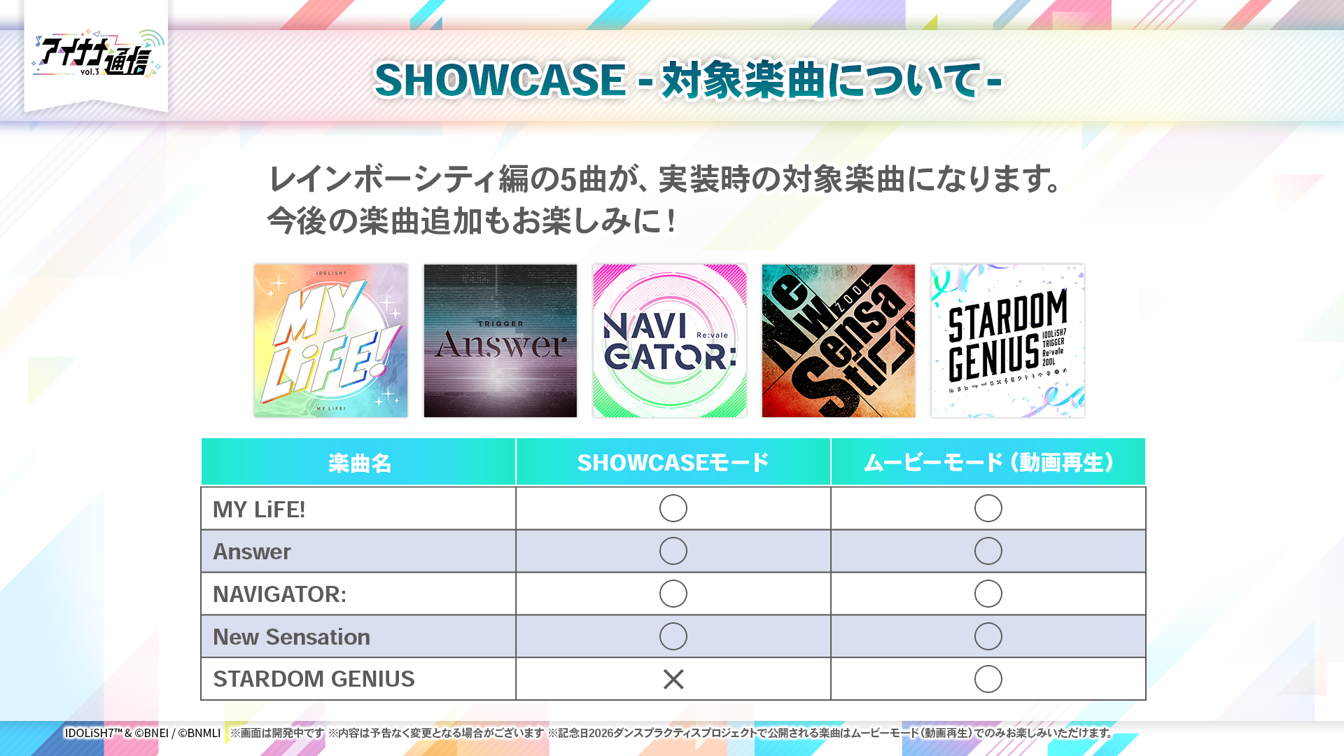SHOWCASE公開時に遊べる楽曲は、「MY LiFW!」「Answer」「NAVIGATOR:」「New Sensation」「STARDOM GENIUS」の全5曲です。