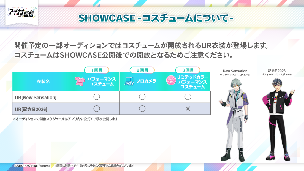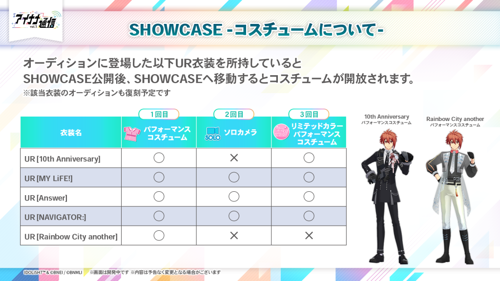 SHOWCASEで遊べるコスチュームは対象のUR衣装を獲得することで開放されます。
