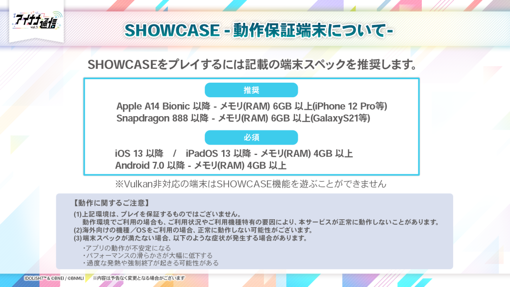 SHOWCASEでは、画像内に記載のある端末でのプレイを推奨しております。